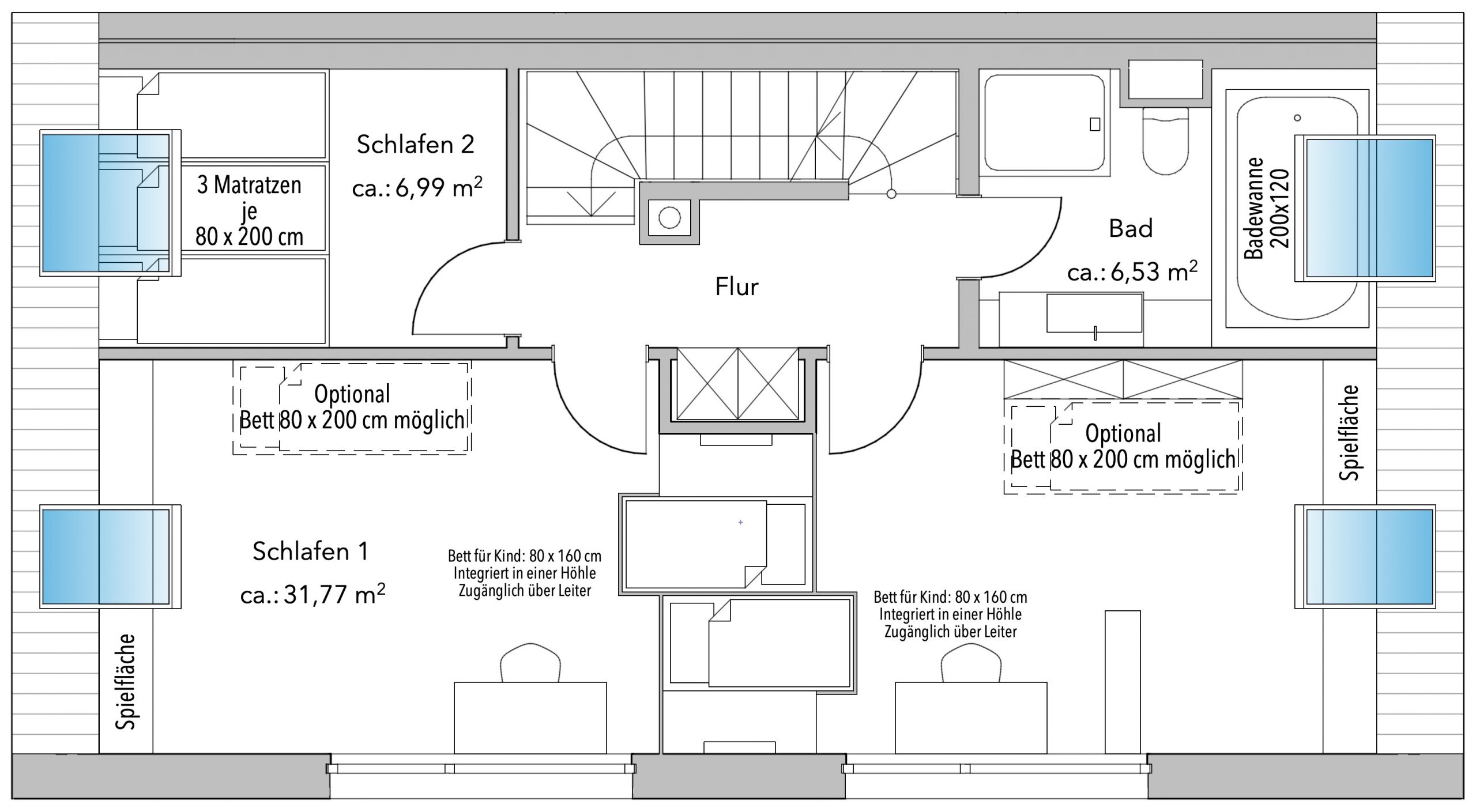 - 1 Schlafzimmer mit Liegewiese (3 x Matratzen 80/200) im 1.OG